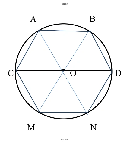 2) Диаметр CD образует два развёрнутых угла с вершиной в центре O, каждый из которых равен $180^\circ$. С помощью транспортира делим каждый из этих развёрнутых углов на три равных угла. Величина каждого такого угла будет $180^\circ \div 3 = 60^\circ$. Откладываем от луча OC (против часовой стрелки) угол в $60^\circ$ и отмечаем точку пересечения его стороны с окружностью буквой A. Затем от луча OA откладываем еще один угол в $60^\circ$ и отмечаем точку пересечения буквой B. Точка B и D образуют третий угол $\angle BOD = 60^\circ$. Повторяем процедуру для второй полуокружности: от луча OD откладываем угол $60^\circ$ и отмечаем точку N, а затем от луча ON откладываем угол $60^\circ$ и отмечаем точку M. Таким образом, мы получаем шесть центральных углов ($\angle COA, \angle AOB, \angle BOD, \angle DON, \angle NOM, \angle MOC$), каждый из которых равен $60^\circ$. Эти углы делят круг на шесть равных частей (секторов).