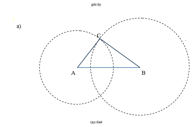 - Соединяем с помощью линейки точку C с точками A и B, получая отрезки AC и BC. В результате построен искомый треугольник ABC.