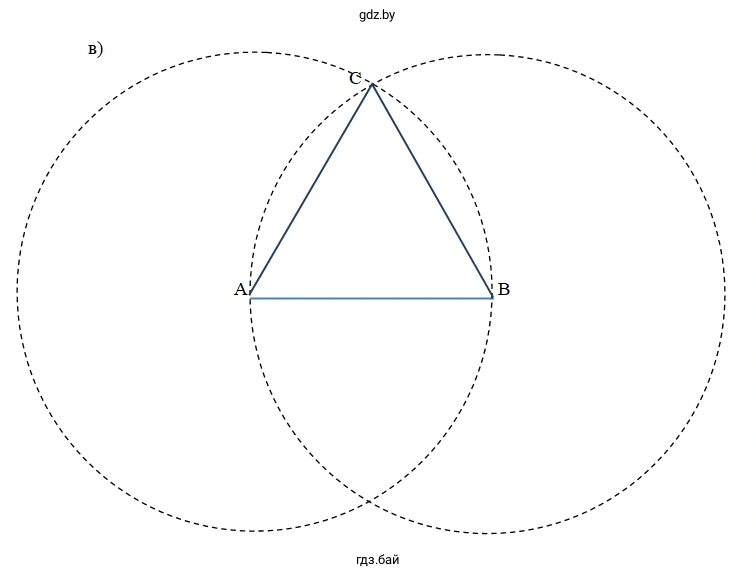Ответ: Построение выполняется по алгоритму: чертим отрезок AB=6 см, затем проводим две дуги радиусом 6 см из центров A и B до их пересечения в точке C, после чего соединяем вершины A, B и C.