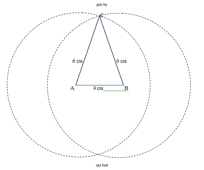 б) Построение этого треугольника аналогично предыдущему. Сначала строим основание $AC$ длиной 4 см. Затем устанавливаем раствор циркуля на 6 см и проводим две дуги из точек $A$ и $C$. Точка их пересечения $B$ будет третьей вершиной. Соединяем вершины и получаем равнобедренный треугольник $ABC$ со сторонами 4 см, 6 см и 6 см. Построение возможно, так как неравенство треугольника выполняется: $6+6 > 4$ и $6+4 > 6$.
