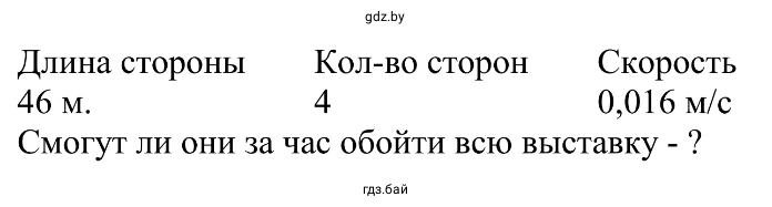 1.26. Фотовыставка размещена в сквере на стендах. Стенды расставлены вокруг квадратного газона со стороной 46 м. Посетители рассматривают экспозицию, двигаясь со скоростью 0,016 м/с. Смогут ли они за час обойти всю выставку?