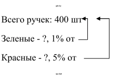 1.46. В коробке лежало 400 гелевых ручек. Из них 1 % составляли ручки зелёного цвета, а 5 % — ручки красного цвета. Сколько ручек зелёного и красного цветов лежало в коробке?