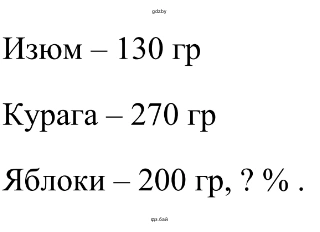 1.61. В смеси сухофруктов 130 г изюма, 270 г кураги и 200 г яблок. Какой процент яблок в смеси?