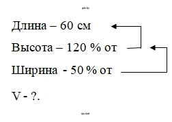 1.65. Длина прямоугольного параллелепипеда равна 60 см, его высота составляет 120 % длины, а ширина составляет 50 % высоты. Найдите объём параллелепипеда.