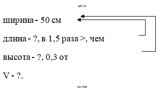 1.69. Ширина прямоугольного параллелепипеда равна 50 см, длина в 1,5 раза больше ширины, а высота составляет 0,3 ширины. Найдите объём параллелепипеда.