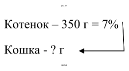 Из условия нам известно, что масса котенка составляет $350$ г, и это соответствует $7\%$ от массы кошки.
