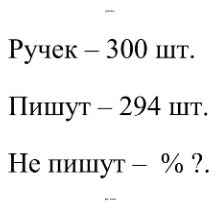 1. Найдем количество непишущих ручек. Для этого из общего количества ручек (300 штук) вычтем количество пишущих ручек (294 штуки).
