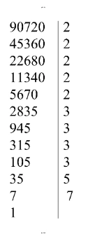 $90720 = (2^4 \cdot 3^4 \cdot 7) \cdot (2 \cdot 5) = 2^5 \cdot 3^4 \cdot 5 \cdot 7$.