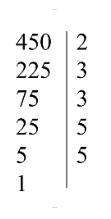 $450 = (3^2 \cdot 5) \cdot (2 \cdot 5) = 2 \cdot 3^2 \cdot 5^2$.