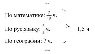 Для этого сложим время, затраченное на каждый из этих предметов: $ \frac{7}{15} $ часа на математику и $ \frac{3}{5} $ часа на русский язык. Чтобы сложить дроби, приведём их к общему знаменателю. Наименьший общий знаменатель для 15 и 5 это 15.