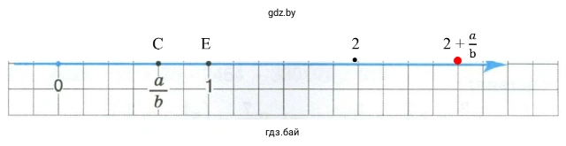 Координата этой точки равна $2\frac{1}{4}$. Для ее нахождения найдем точку с координатой 3. Она находится на $3 \div \frac{1}{4} = 12$ делений правее нуля. От этой точки нужно отступить влево на расстояние, равное $\frac{a}{b}$, то есть на 3 деления. В итоге точка будет находиться на $12 - 3 = 9$ делений правее нуля. Это соответствует точке с координатой $2\frac{1}{4}$.