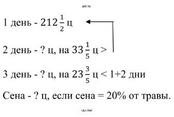 По условию, в первый день скосили $212\frac{1}{2}$ ц травы, а во второй день — на $33\frac{1}{5}$ ц больше. Чтобы найти количество травы, скошенной во второй день, необходимо сложить эти два значения. Для удобства вычислений приведем смешанные числа к общему знаменателю.