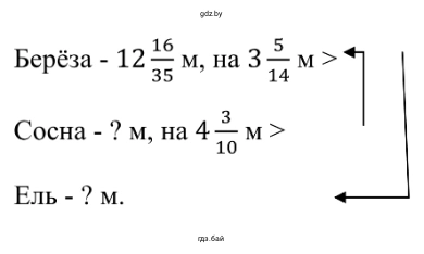 Из условия известно, что берёза выше ели на $3\frac{5}{14}$ м. Это значит, что ель ниже берёзы на эту же величину. Высота берёзы составляет $12\frac{16}{35}$ м. Чтобы найти высоту ели, нужно из высоты берёзы вычесть разницу.