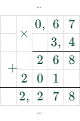 - Выполнить умножение, не обращая внимания на запятые: $34 \times 67 = 2278$.