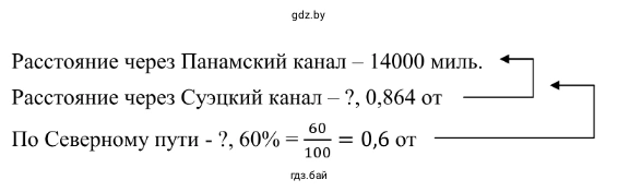 Расстояние по Северному морскому пути составляет 66% от расстояния через Суэцкий канал. Чтобы найти процент от числа, нужно умножить число на дробь, соответствующую проценту ($66\% = 0,66$).