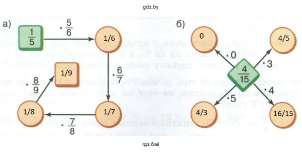 В этой схеме нужно умножить центральное число $\frac{4}{15}$ на числа, указанные на стрелках, чтобы найти значения в пустых кружках.