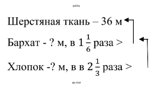 По условию задачи, шерстяной ткани закупили 36 м, а бархата — в $1\frac{1}{6}$ раза больше. Чтобы найти количество бархата, необходимо количество шерстяной ткани умножить на $1\frac{1}{6}$.