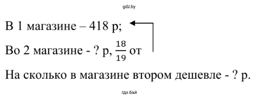 1. Сначала найдем цену коробки конфет во втором магазине. По условию, она составляет $\frac{18}{19}$ от цены в первом магазине (418 рублей). Чтобы найти дробь от числа, нужно умножить это число на данную дробь.