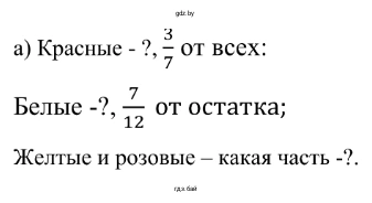 3. Белые тюльпаны составляют $ \frac{7}{12} $ от этого остатка ($ \frac{4}{7} $). Остальные тюльпаны в этом остатке — жёлтые и розовые. Найдем, какую долю от остатка составляют жёлтые и розовые тюльпаны. Для этого вычтем долю белых тюльпанов из целого остатка (приняв его за 1):