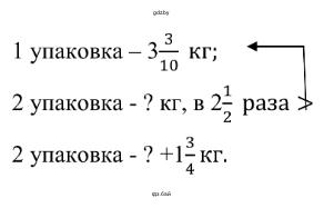 Вес первой упаковки составляет $3 \frac{3}{10}$ кг. Вторая упаковка весит в $2 \frac{1}{2}$ раза больше. Чтобы найти вес второй упаковки, нужно вес первой упаковки умножить на $2 \frac{1}{2}$. Для удобства вычислений преобразуем смешанные числа в неправильные дроби: