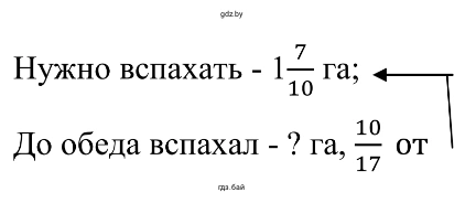 Чтобы определить, сколько гектаров земли вспахал фермер до обеда, необходимо найти часть от целого. В данном случае целое — это общая площадь участка, а часть — это доля, которую он вспахал. Общая площадь участка составляет $1\frac{7}{10}$ га. Доля вспаханной земли равна $\frac{10}{17}$.