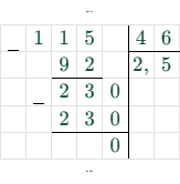 1. Выполним деление в скобках: $11,5 : 4,6$. Чтобы разделить на десятичную дробь, перенесем запятую в делимом и делителе на один знак вправо: $115 : 46 = 2,5$.