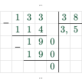 1. Выполним деление в скобках: $13,3 : 3,8$. Перенесем запятую в делимом и делителе на один знак вправо: $133 : 38 = 3,5$.