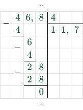 3. Выполним деление: $4,68 : 0,4$. Перенесем запятую в делимом и делителе на один знак вправо: $46,8 : 4 = 11,7$.