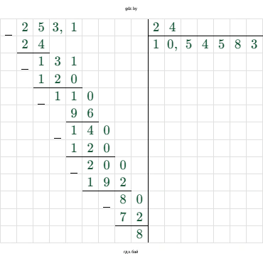 б) Чтобы найти частное от деления $25,31$ на $2,4$, умножим делимое и делитель на 10, чтобы делитель стал целым числом:
