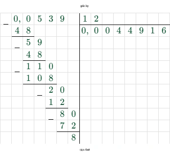 г) Чтобы найти частное от деления $0,00539$ на $1,2$, умножим делимое и делитель на 10, чтобы делитель стал целым числом: