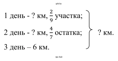 Из условия мы знаем, что эта часть, равная $\frac{3}{7}$ от остатка, составляет 6 км. Чтобы найти всю длину остатка после первого дня (целое по его части), нужно число разделить на дробь: