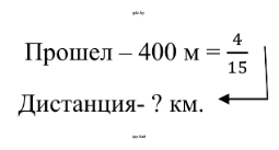 Из условия задачи известно, что 400 метров, которые прошёл Никита, составляют $\frac{4}{15}$ всей дистанции. Это означает, что всю дистанцию можно разделить на 15 равных частей, и 4 из этих частей составляют 400 м. Чтобы найти общую длину дистанции, можно действовать по шагам.