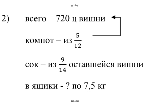 2) В плодоводческом хозяйстве собрали 720 ц вишни. Из 512 всей вишни сварили варенье, 914 оставшейся вишни переработали на сок, а остальную вишню расфасовали в ящики по 7,5 кг и отправили на продажу. Сколько ящиков вишни отправили на продажу?