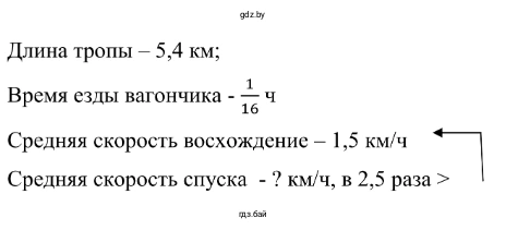 $t_{подъема\_1} = \frac{S}{v_{подъема}} = \frac{5,4 \text{ км}}{1,5 \text{ км/ч}} = 3,6 \text{ часа}$