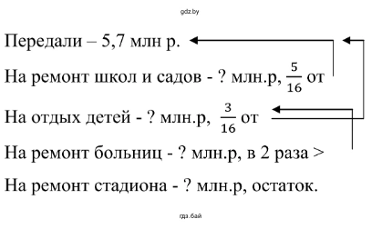 8. Участники благотворительного концерта передали 5,7 млн р. городу, пострадавшему после наводнения. На ремонт школ и детских садов было использовано 56 этой суммы, на отправку детей на отдых в другие регионы — 316 этой суммы, на ремонт больниц — в 2 раза больше, чем на отдых детей, оставшуюся сумму направили на ремонт стадиона. Сколько денег было направлено на ремонт стадиона и на отдых детей?