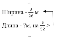 По условию задачи ширина прямоугольника равна $ \frac{3}{26} $ м, а его длина на $ \frac{5}{52} $ м больше. Чтобы найти длину, необходимо сложить ширину и величину, на которую длина больше ширины.