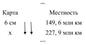 $\frac{6 \text{ см}}{149,6 \text{ млн км}} = \frac{x \text{ см}}{227,9 \text{ млн км}}$