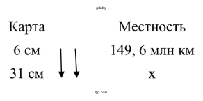 $\frac{6 \text{ см}}{149,6 \text{ млн км}} = \frac{31 \text{ см}}{y \text{ млн км}}$