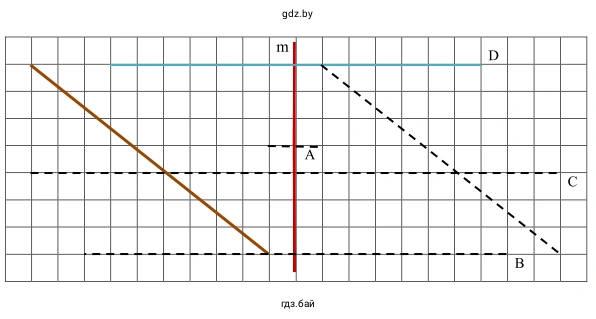4. Находим точку D', симметричную точке D. Точка $D$ расположена на расстоянии 4 клеток справа от оси $m$. Следовательно, симметричная ей точка $D'$ будет расположена на расстоянии 4 клеток слева от оси $m$ на той же горизонтальной линии.