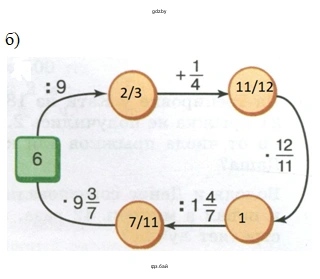 4. Значение в нижнем левом кружке. Умножаем начальное число 6 на $9\frac{3}{7}$. Преобразуем смешанное число в неправильную дробь: