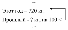 По условию, в этом году школьники собрали 720 кг макулатуры, что на 100 кг больше, чем в прошлом году. Чтобы найти прошлогодний результат, нужно из результата этого года вычесть разницу: