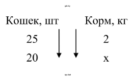 Эту же задачу можно решить с помощью пропорции. Пусть $x$ — это количество корма, необходимое для 20 кошек. Составим пропорцию: