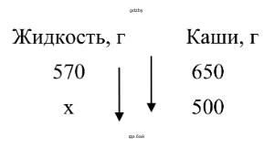 Ответ: для приготовления 500 г жидкой манной каши необходимо 455 г (или 455 мл) жидкости.