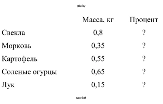 4.116. 1) Для приготовления винегрета использовали 0,8 кг свёклы, 0,35 кг моркови, 0,55 кг картофеля, 0,65 кг солёных огурцов и 0,15 кг лука. Найдите процентное содержание каждого вида овощей, взятых для приготовления винегрета.