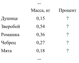 2) Для приготовления травяного чая смешали 0,15 кг душицы, 0,54 кг зверобоя, 0,36 кг ромашки, 0,27 кг чабреца и 0,18 кг мяты. Найдите процентное содержание каждого вида трав в полученной смеси.