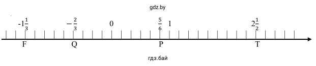 Ответ: Точку P($\frac{5}{6}$) нужно отметить на 5 клеток правее нуля, точку F($-1\frac{1}{3}$) — на 8 клеток левее нуля, точку T($2\frac{1}{2}$) — на 15 клеток правее нуля, а точку Q($-\frac{2}{3}$) — на 4 клетки левее нуля.