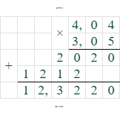 Умножим $404$ на $305$, получим $123220$. В первом множителе ($4,04$) два знака после запятой, и во втором ($3,05$) также два. Следовательно, в результате нужно отделить $2+2=4$ знака: $12,3220$ или $12,322$.