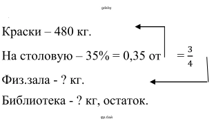 4.29. 1) Для ремонта школы было израсходовано 480 кг краски. На покраску столовой ушло 35 % всей краски, что составляет 34 краски, израсходованной для ремонта физкультурного зала. Остальной краской покрасили библиотеку. Сколько краски израсходовано на ремонт библиотеки?