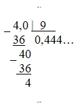 При делении в частном бесконечно повторяется цифра 4. Это чистая периодическая дробь, которая записывается как $0,(4)$.