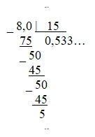 б) Чтобы перевести дробь $\frac{8}{15}$ в десятичную, разделим числитель 8 на знаменатель 15: